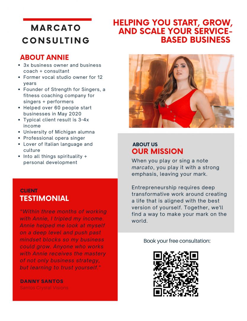 In 2020, my clients (mostly singers & performers) lost their income, and so I did, too. I knew I could help them make money online, so I led an online workshop that helped 60 of my fellow singers start online businesses during covid. Now I work with businesses of every kind – voice teachers, fitness instructors, astrologers, grant writing agency owners, dating coaches, etc. I love empowering people to do work that aligns with their best self.