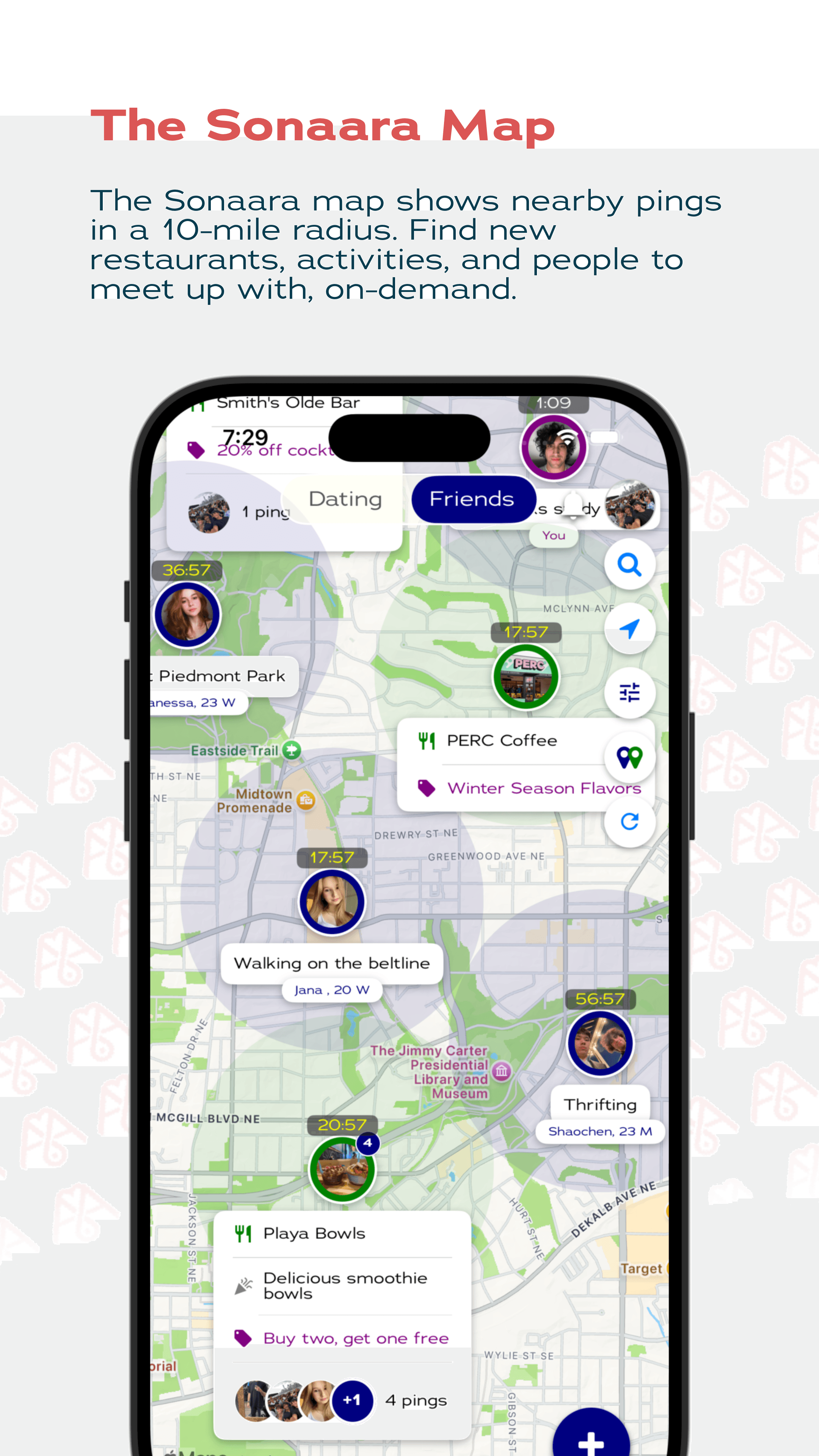 Existing meetup platforms fail to foster spontaneous, in-person connections, leaving both individuals and local businesses underserved. Sonaara instantly connects users seeking spontaneous, real-time hangouts at nearby businesses, making spontaneous meetups seamless and discoverable. By enabling real-time, location-based connections and integrating businesses directly into the social discovery process, we deliver immediate value and authenticity that other platforms lack. Our approach creates a dynamic, mutually beneficial ecosystem between users and businesses that established competitors fail to deliver.