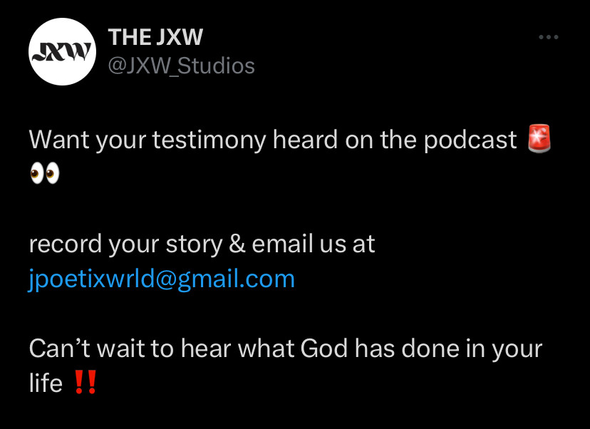 I created my new artist name, jpoetix Wrld by inspiration to my love for poetry, and from there I started, “THE JXW”. A Christian media company that is solely focused to help people: