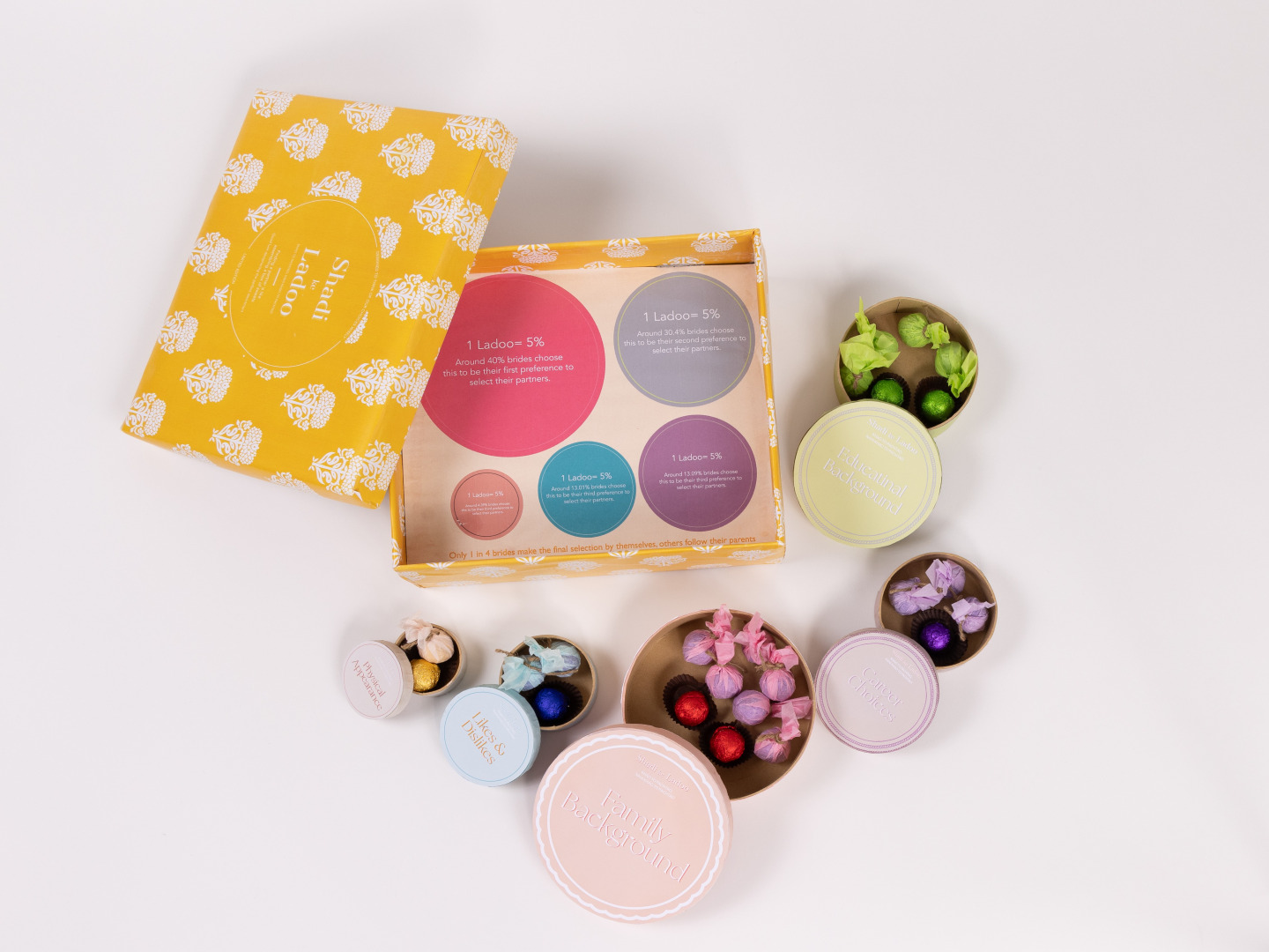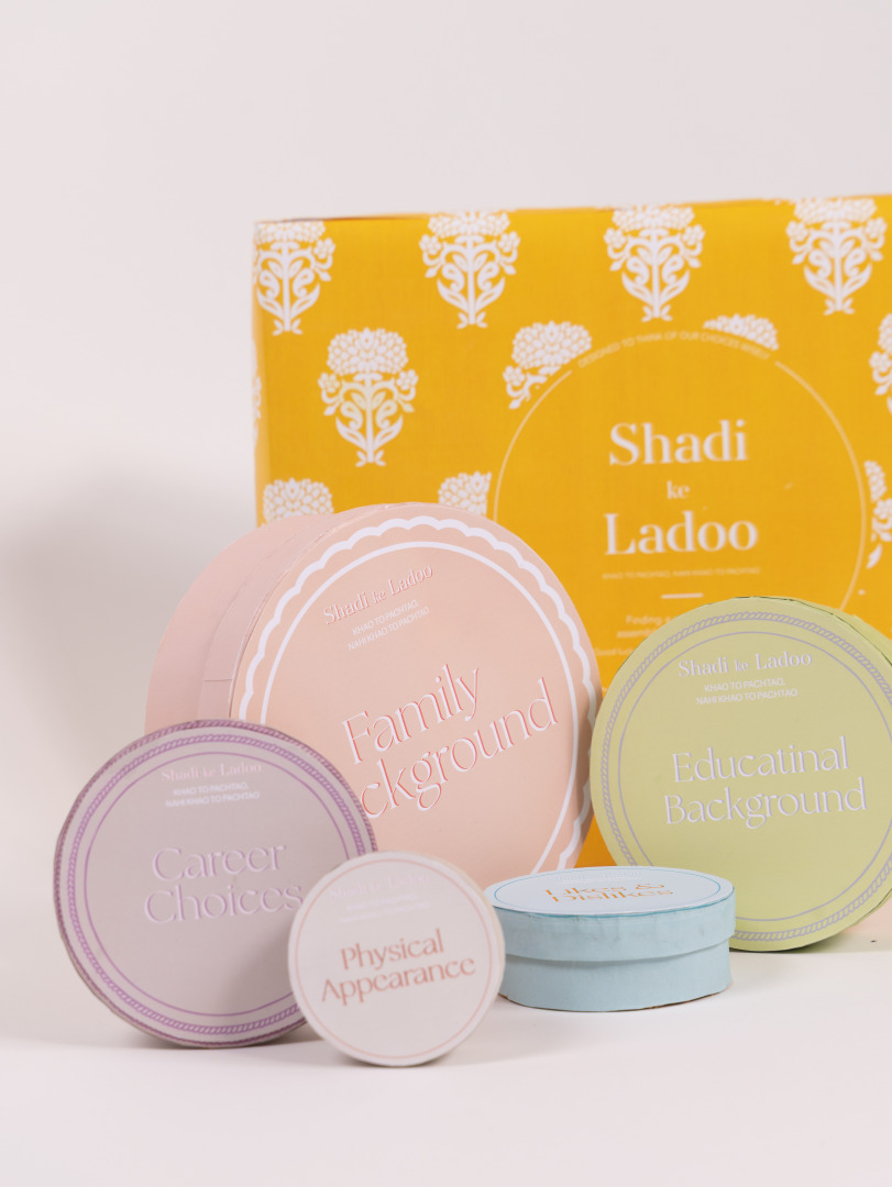 In another project, Shaadi Ke Ladoo (“Wedding Sweets”), I explored the paradoxes of modern Indian arranged marriages through data storytelling. The project took the form of a sweet box, divided into compartments representing the different factors brides consider when choosing a partner, based on research findings. Each compartment revealed a deeper, often uncomfortable truth: “Family background” masked casteism, while “physical appearance” often meant colorism. Each box contained a chocolate ladoo, an Indian sweet symbolizing not just tradition, but the weight of hidden social codes. It was my way of using form and flavor to unbox the subtle forces shaping women’s choices.