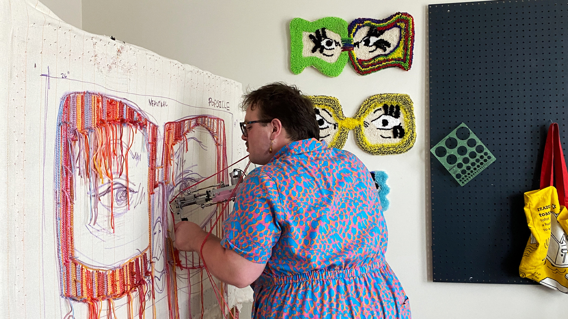 My fiber art is all about having fun, while exploring my personal experiences as a fat, fem, queer person. Allowing myself to play in the loud beauty of imperfection, while stripping away expectations that are placed on me. A lot of what I do is in bright colors, funky shapes with loose line work that looks to capture the rawness of mistakes through the manipulation of yarn. Through this I have fallen in love with the intuitive process and expressing it through tufting. This love is what helped motivate me in deciding that this year I would organize my first ever textile exhibition. I just finished up the show here in Memphis, TN and I would have to say that this is one of those “at a certain point” moments that I am incredibly proud of and excited about.