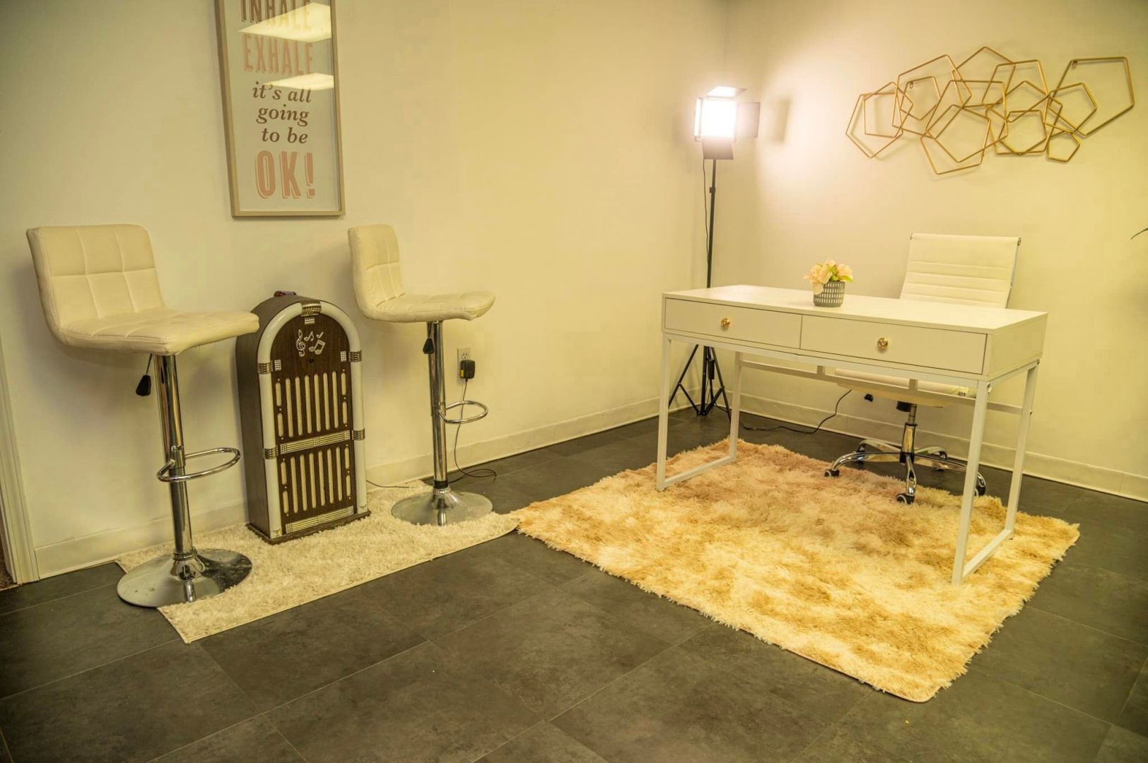 Second, a longtime friend and fellow Attorney, Jerbrina Johnson (no relation), immediately answered the call to help me with the visual layout of the studio. I have very little aesthetic vision and Jerbrina does. Before the studio renovation, she gave great suggestions on colors and arrangement. While I picked up additional help in furnishing the studio, Jerbina was very present in the few days before our first studio tour selecting and picking up accent pieces and rugs. She was definitely a life saver in this venture.
